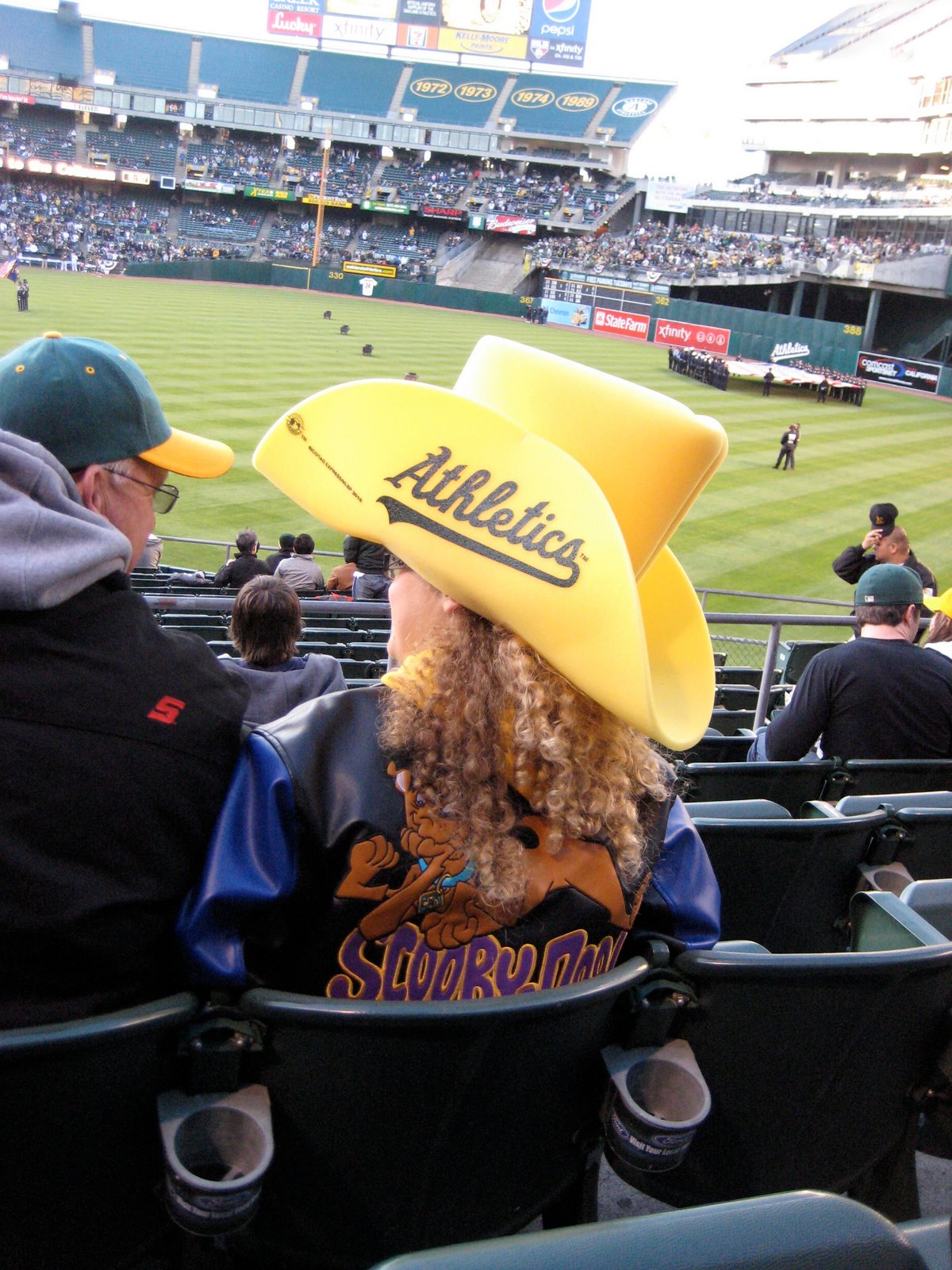 2. The fashion sense at an Oakland game never ceases to amaze me. Take this young girl, scooby doo jacket and yellow, foam, A’s Cowboy hat.